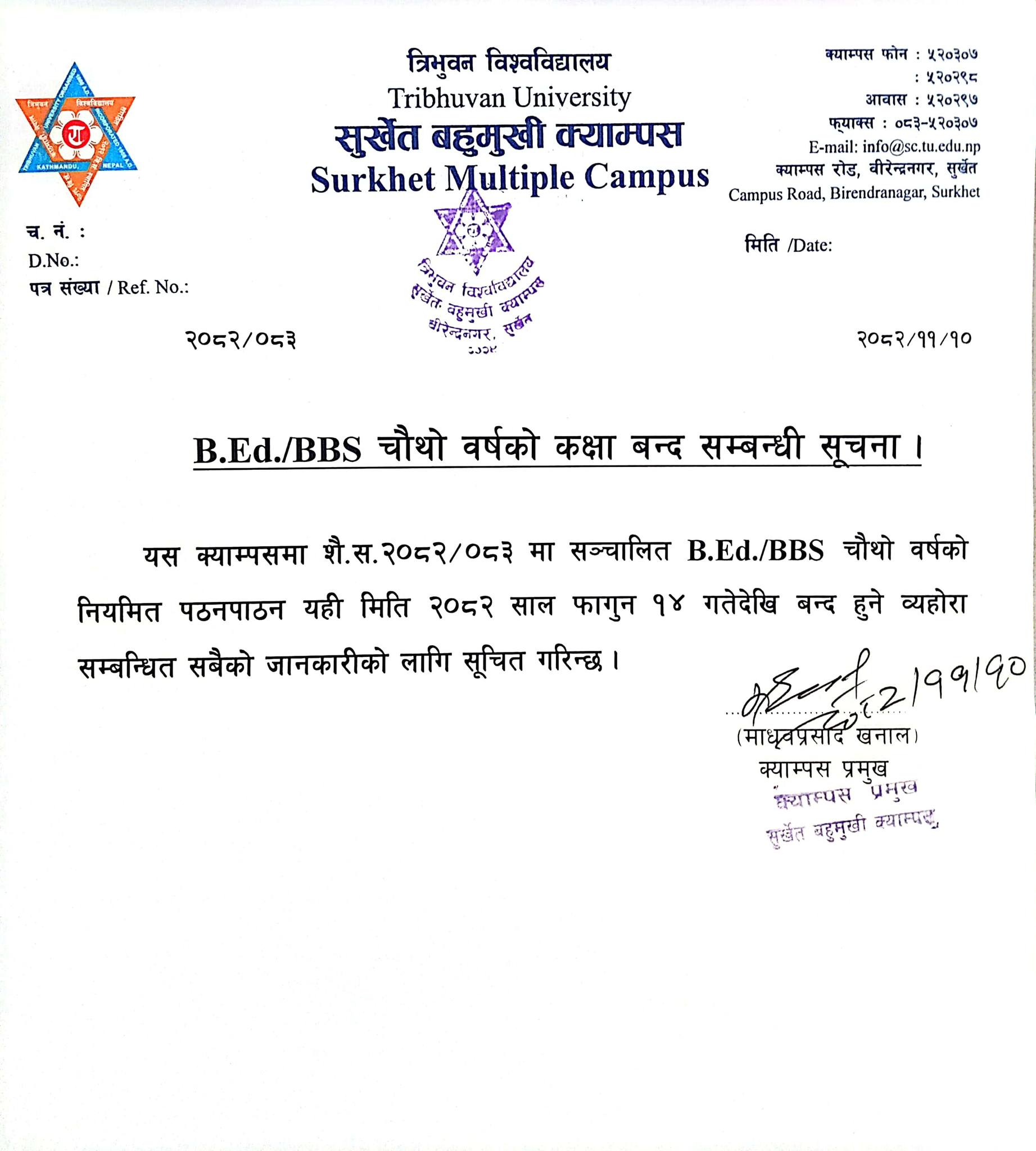 B.Ed.BBS चौथो वर्षको कक्षा बन्दसम्बन्धी सूचना ।